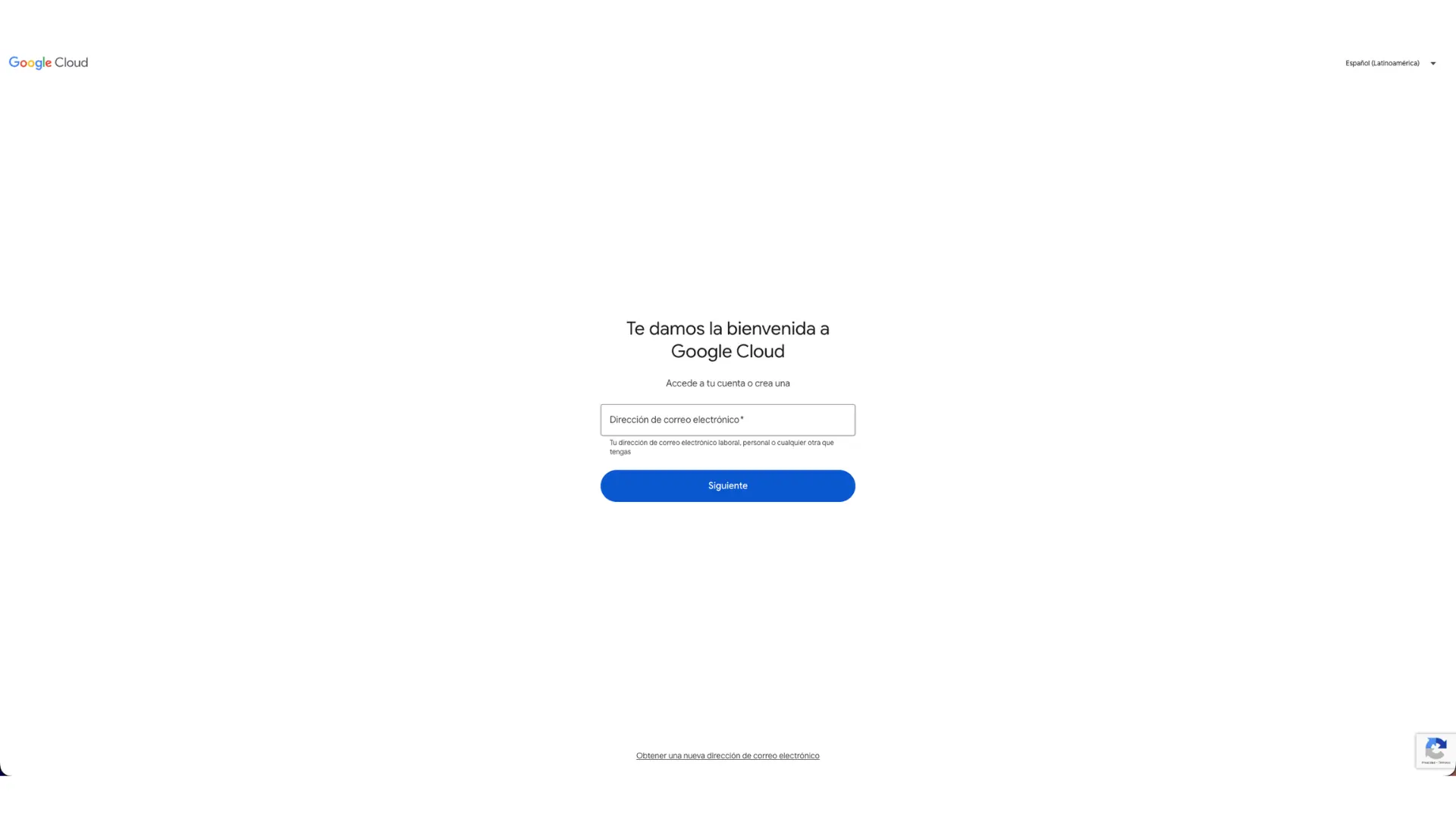 El proceso comienza en la pantalla de acceso de Google Cloud. Aquí verás un campo para ingresar tu dirección de correo electrónico y continuar con el registro o inicio de sesión. Si ya tienes una cuenta de Google, puedes usarla directamente. Si todavía no cuentas con una, deberás crearla antes de seguir.