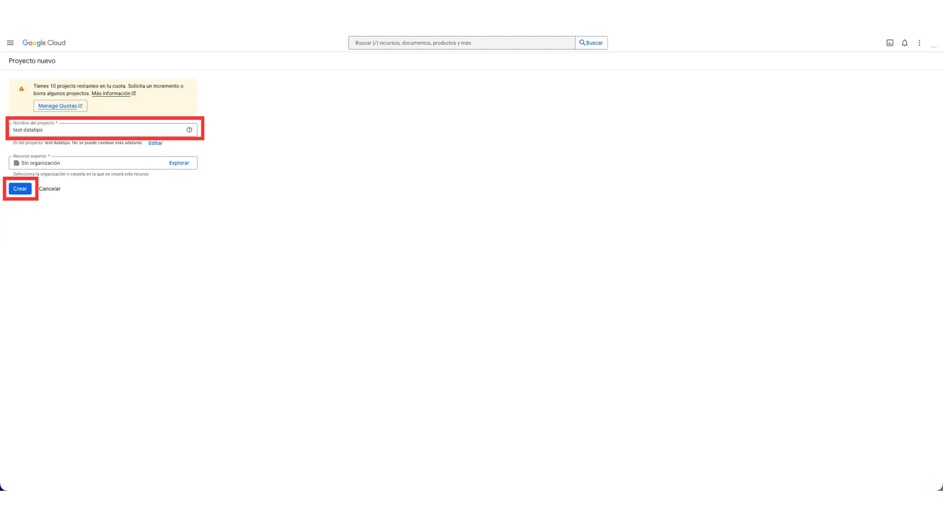 No hace falta complicarse demasiado. Un nombre claro suele ser suficiente. Por ejemplo, puedes usar el nombre de tu empresa, el nombre del sitio o una variante fácil de identificar. La idea es que, si en el futuro vuelves a entrar a Google Cloud, sepas inmediatamente cuál es el proyecto correcto.