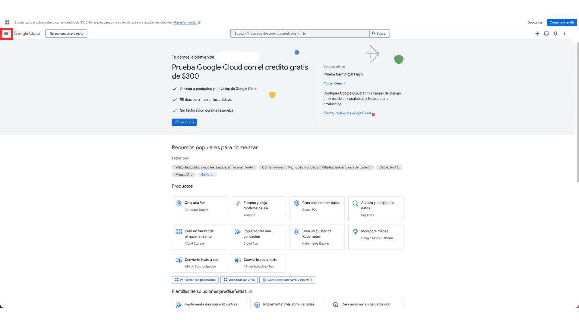 Con el proyecto ya creado, el siguiente paso es abrir el menú principal de Google Cloud. En la captura se destaca el ícono de menú en la esquina superior izquierda. Desde ahí se despliega la navegación general de la plataforma.