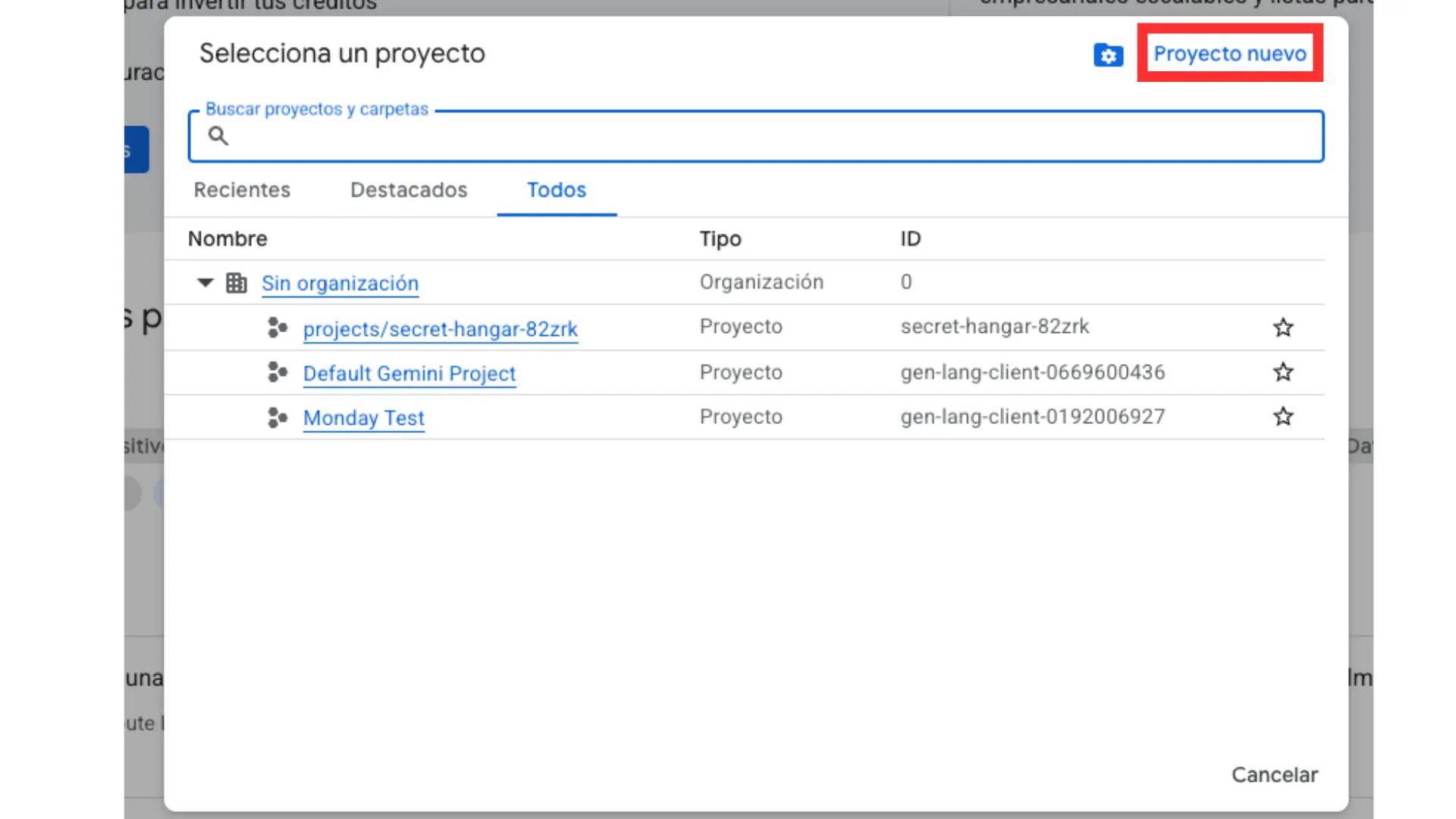 Una vez abierto el selector, Google Cloud te mostrará una ventana con proyectos recientes, destacados o disponibles en tu cuenta. En la esquina superior derecha verás la opción “Proyecto nuevo”. Ese es el botón que debes presionar para avanzar.