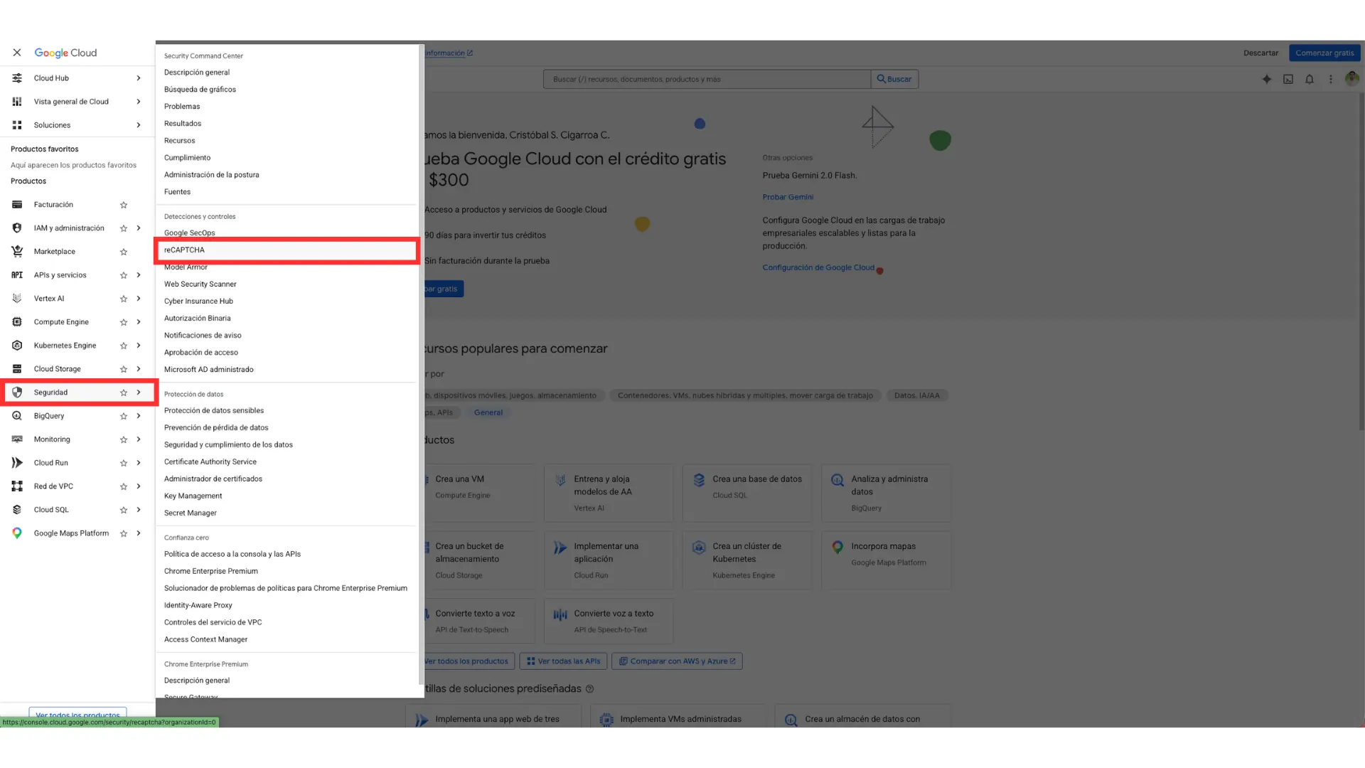 Si al abrir el menú ves muchas opciones, no te abrumes. Google Cloud incluye numerosos servicios, pero en esta guía solo necesitas seguir una ruta concreta. Una vez dentro de reCAPTCHA, el proceso vuelve a simplificarse bastante.